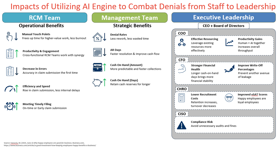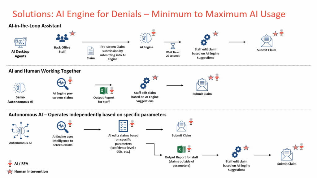 Claims Denials management is critical for healthcare providers to optimize revenue and reduce financial leakage caused by claim denials. We combine the approach of using Claims Data to identify denials patterns by using AI and Machine Learning; our automations can invoke automations pre-submission and post denial.